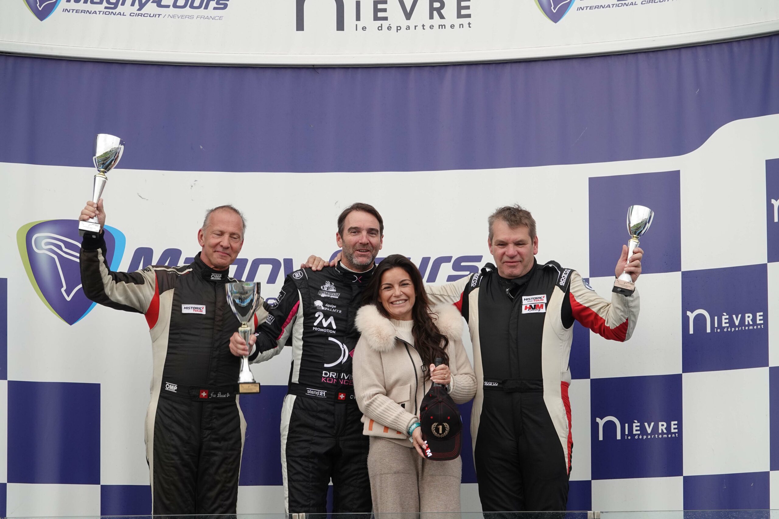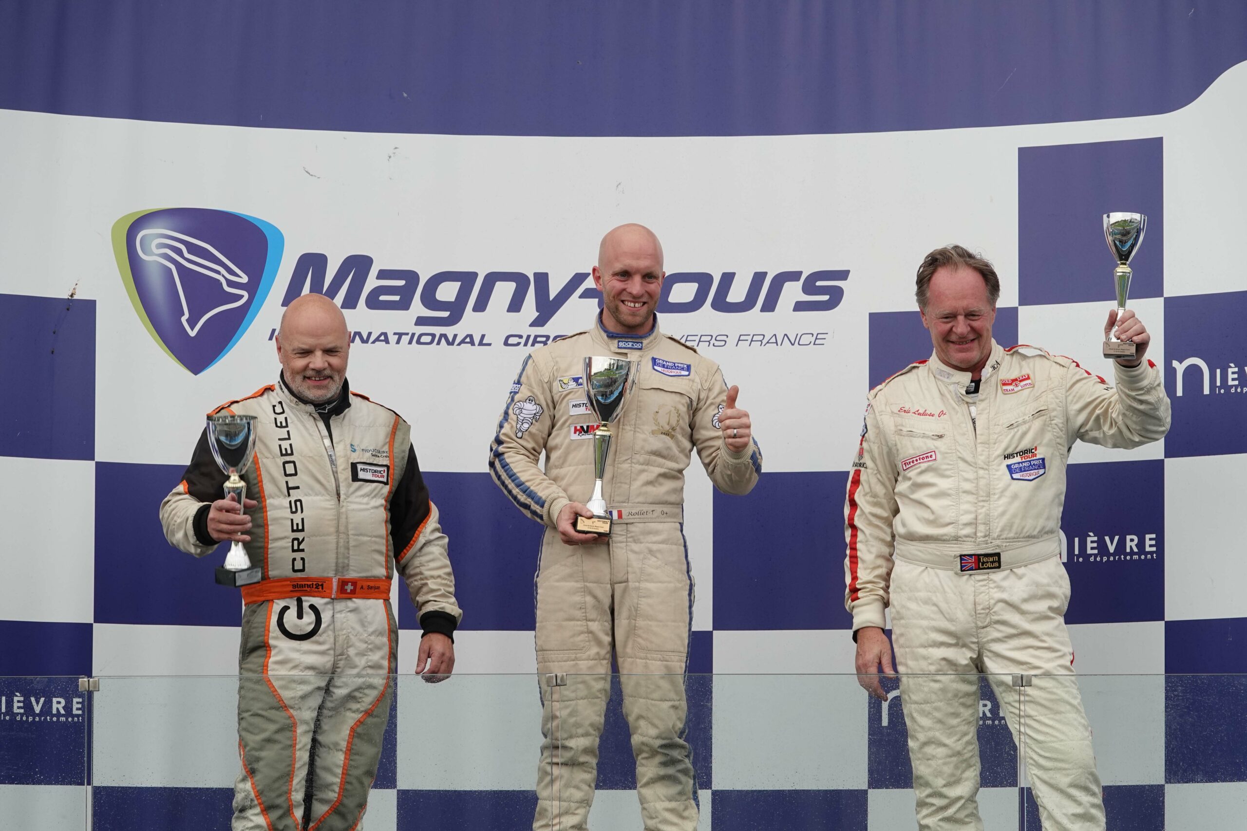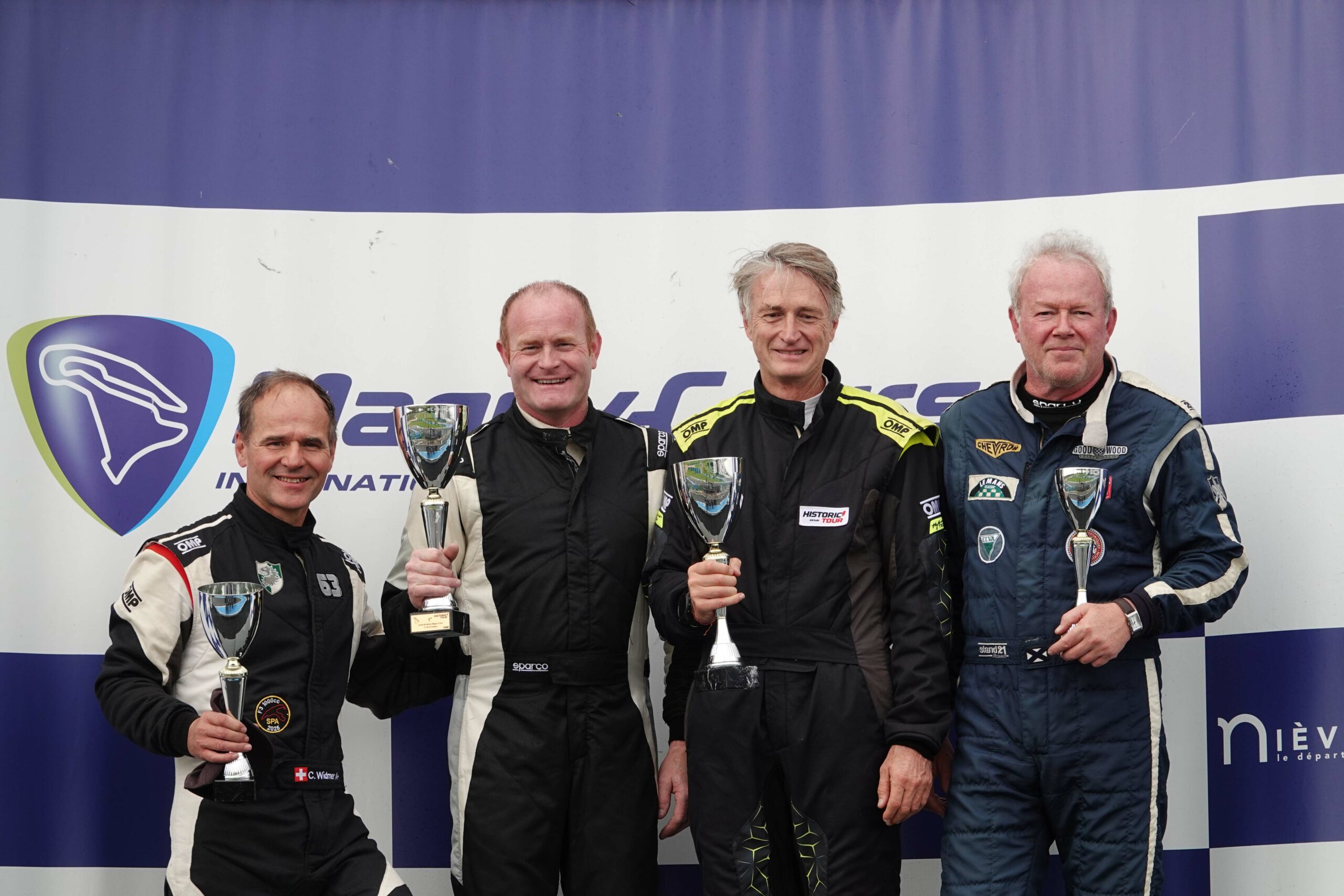 le vainqueur en Classe B (Challenge MOTUL) François BELLE entouré de Régis PREVOST et de Guillaume MAILLARD le patron de SODIPNEU (distributeur exclusif pour la France des pneus NOVA-AVON) qui a offert, comme chaque année, des pneus aux vainqueurs du Challenge Formula Ford Historic France