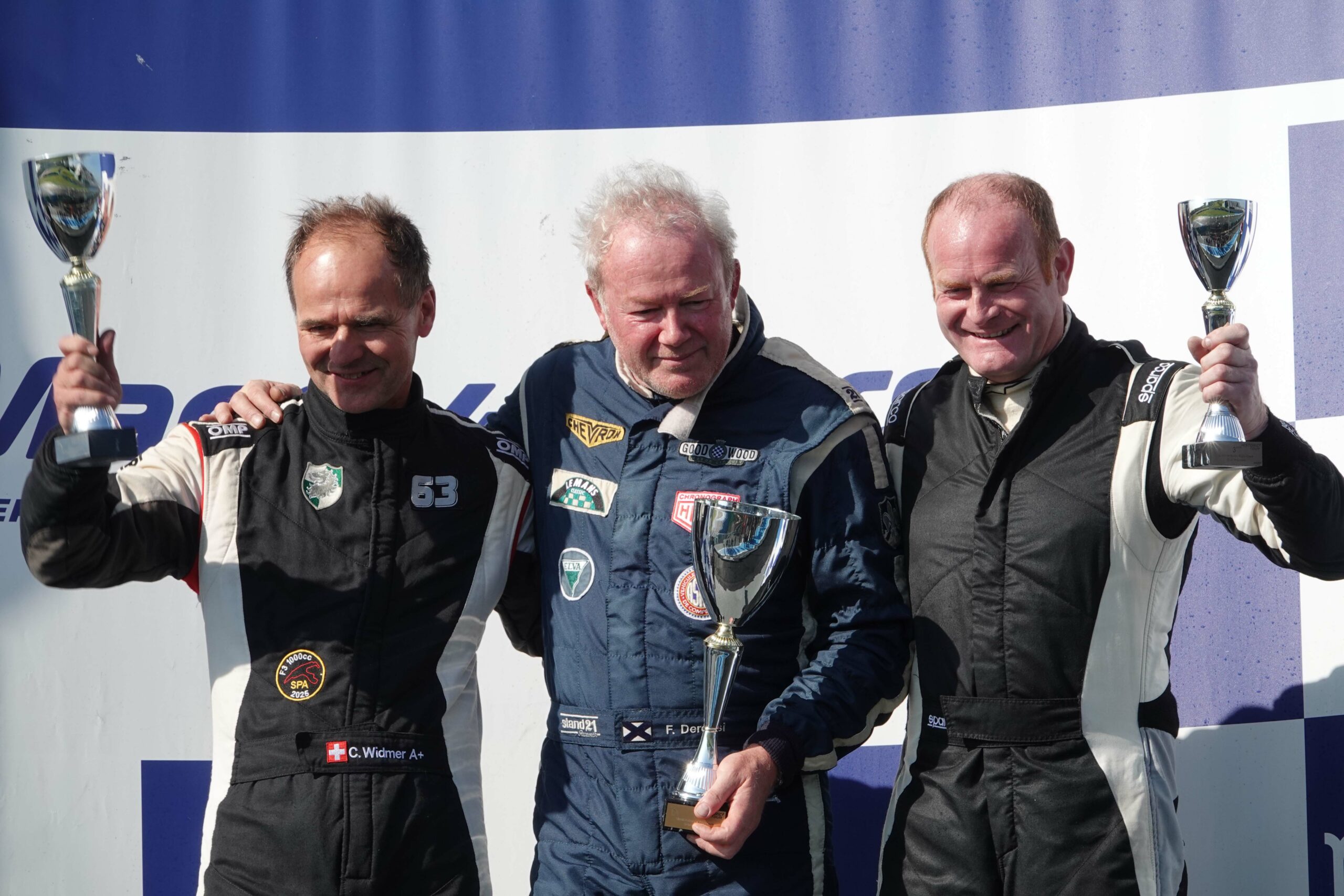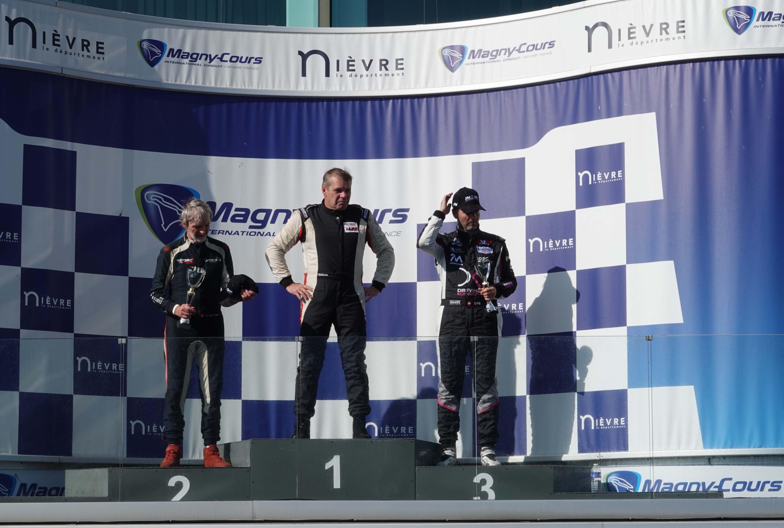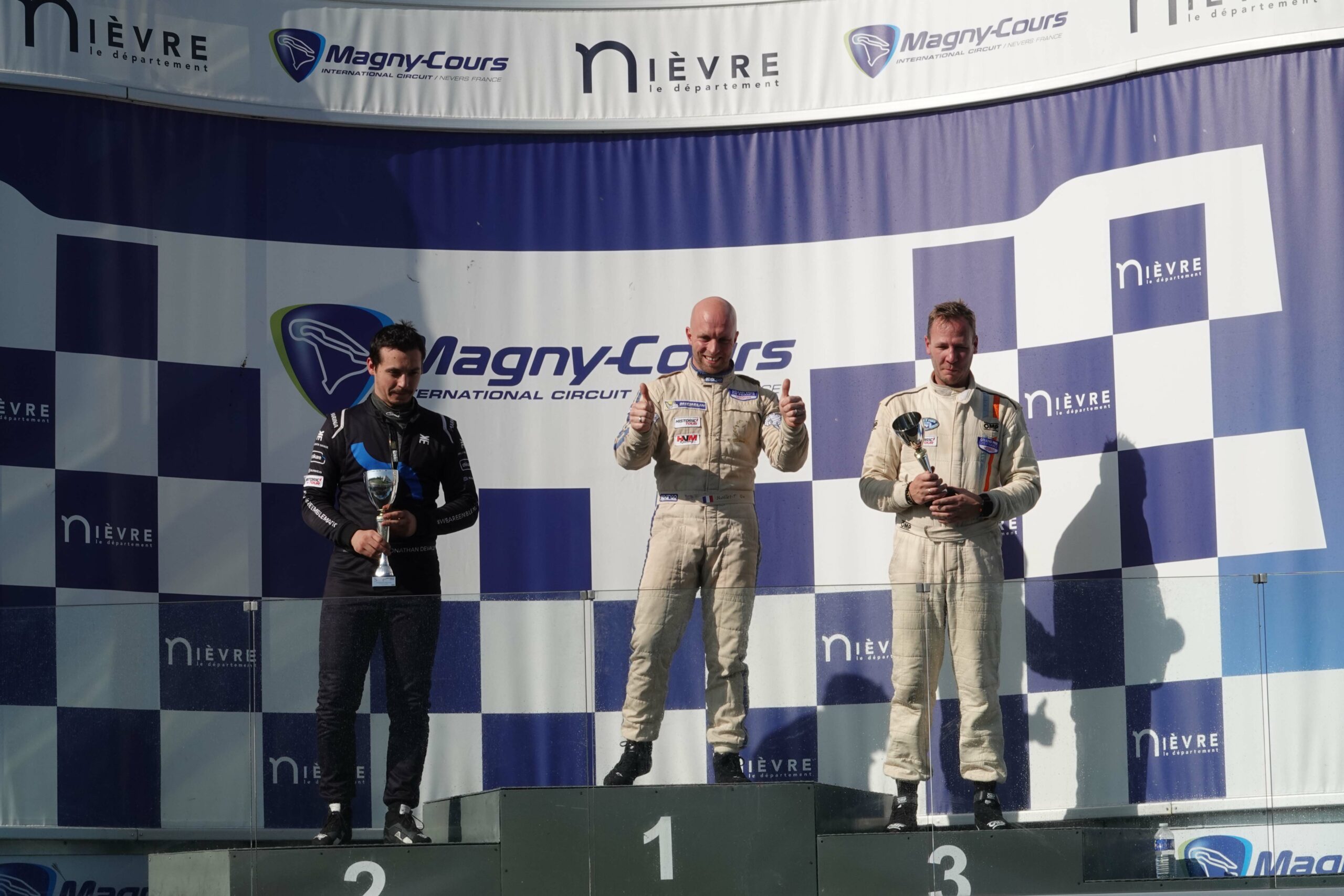 le vainqueur en Classe B (Challenge MOTUL) François BELLE entouré de Régis PREVOST et de Guillaume MAILLARD le patron de SODIPNEU (distributeur exclusif pour la France des pneus NOVA-AVON) qui a offert, comme chaque année, des pneus aux vainqueurs du Challenge Formula Ford Historic France