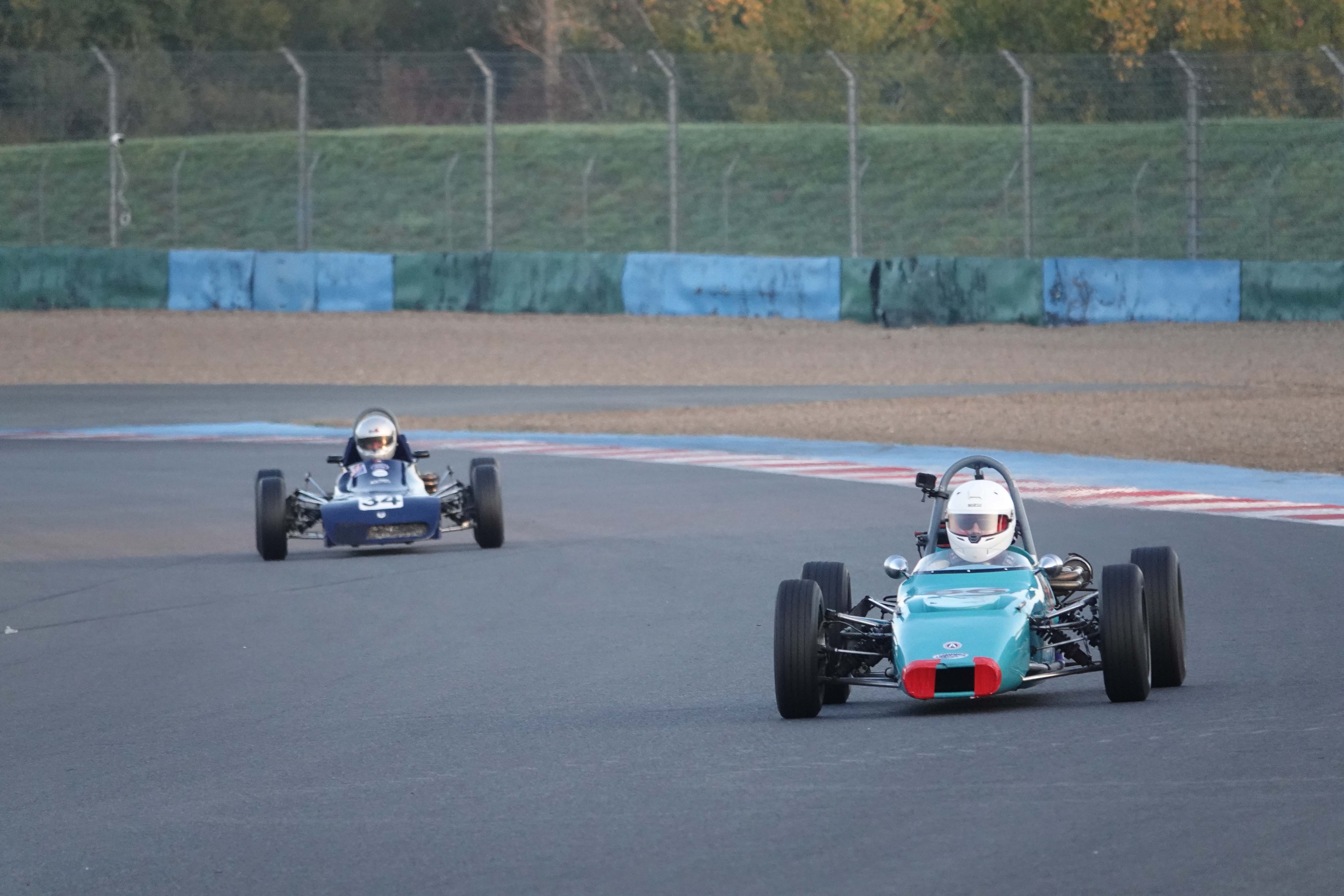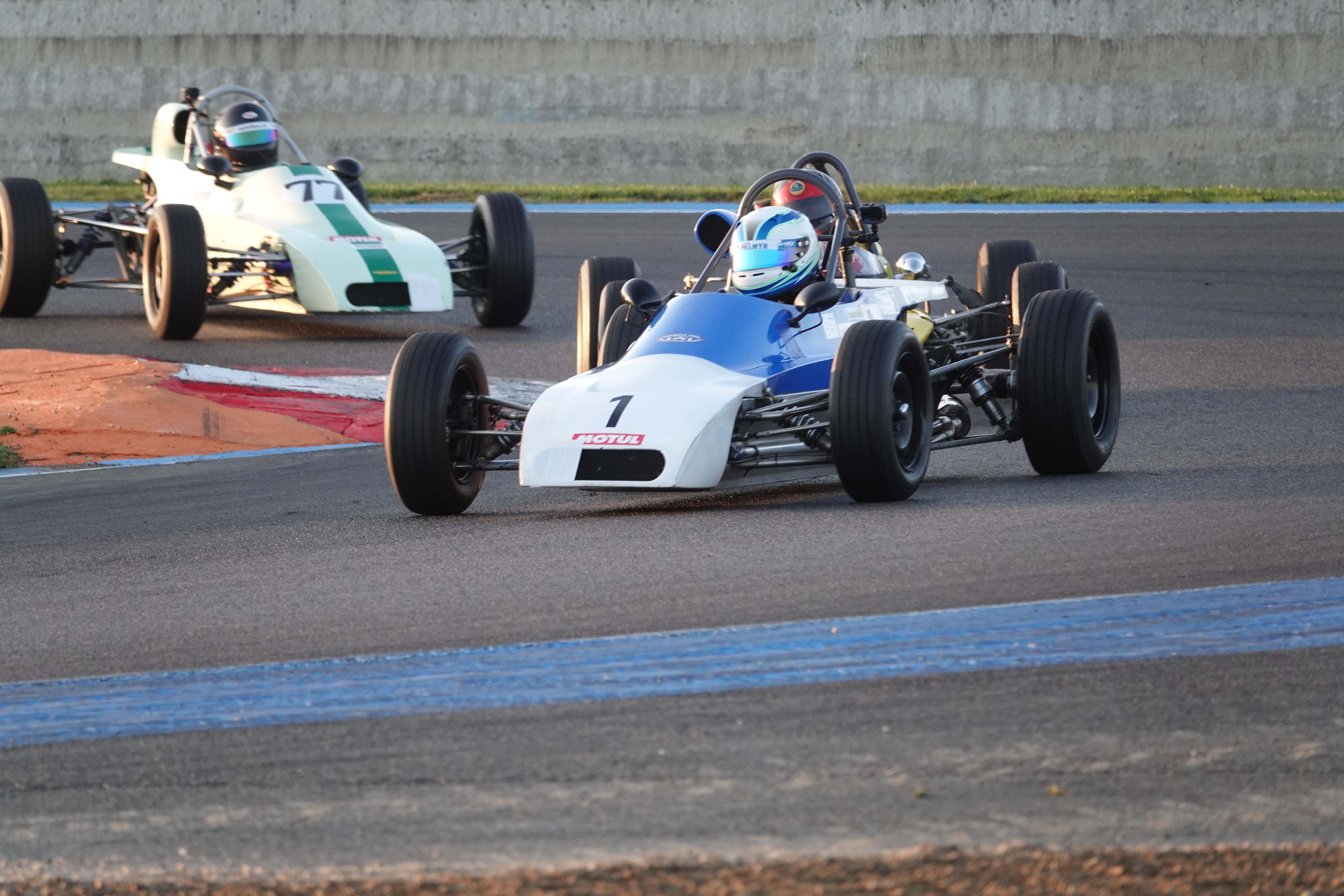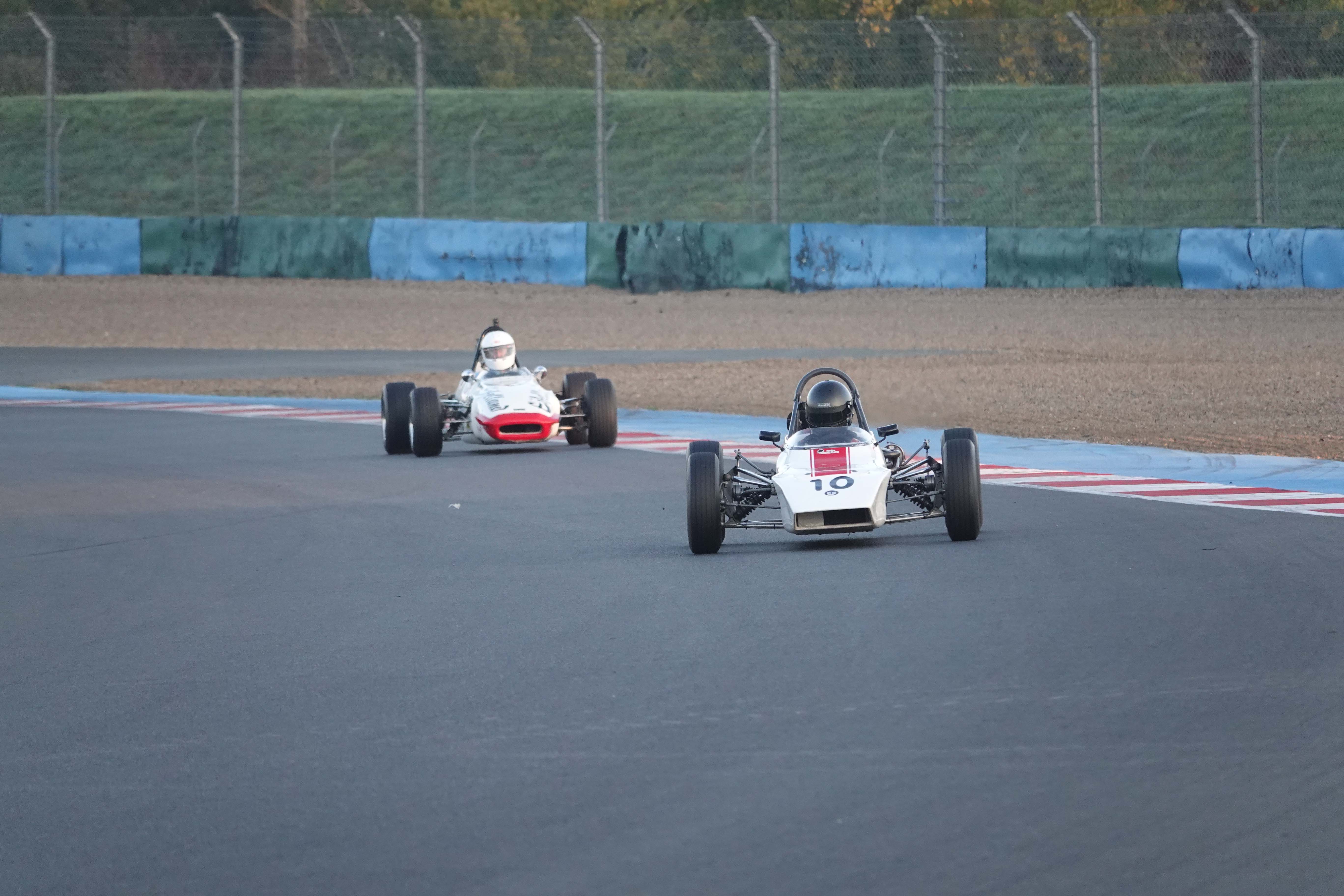 Après une Grid Walk sous un beau soleil automnal, les pilotes se sont engagés dans leur première confrontation du week-end en début d’après-midi. Un départ sans encombre où les positions des quatre leaders sont maintenues, tandis que François Derossi gagne deux places sur Jonathan Devaux (Crosslé 16 F) et Augustin Sanjuan dans le peloton. Dans le troisième tour de course, le Suisse Christian Vaglio-Giors dépasse François Belle et prend la tête. François Belle, en pleine bataille pour le Championnat de France, repasse le Suisse dans le tour suivant. Troisième tour qui voit également l’abandon du Neuilléen Nicolas Leblond (Dulon LD 4).