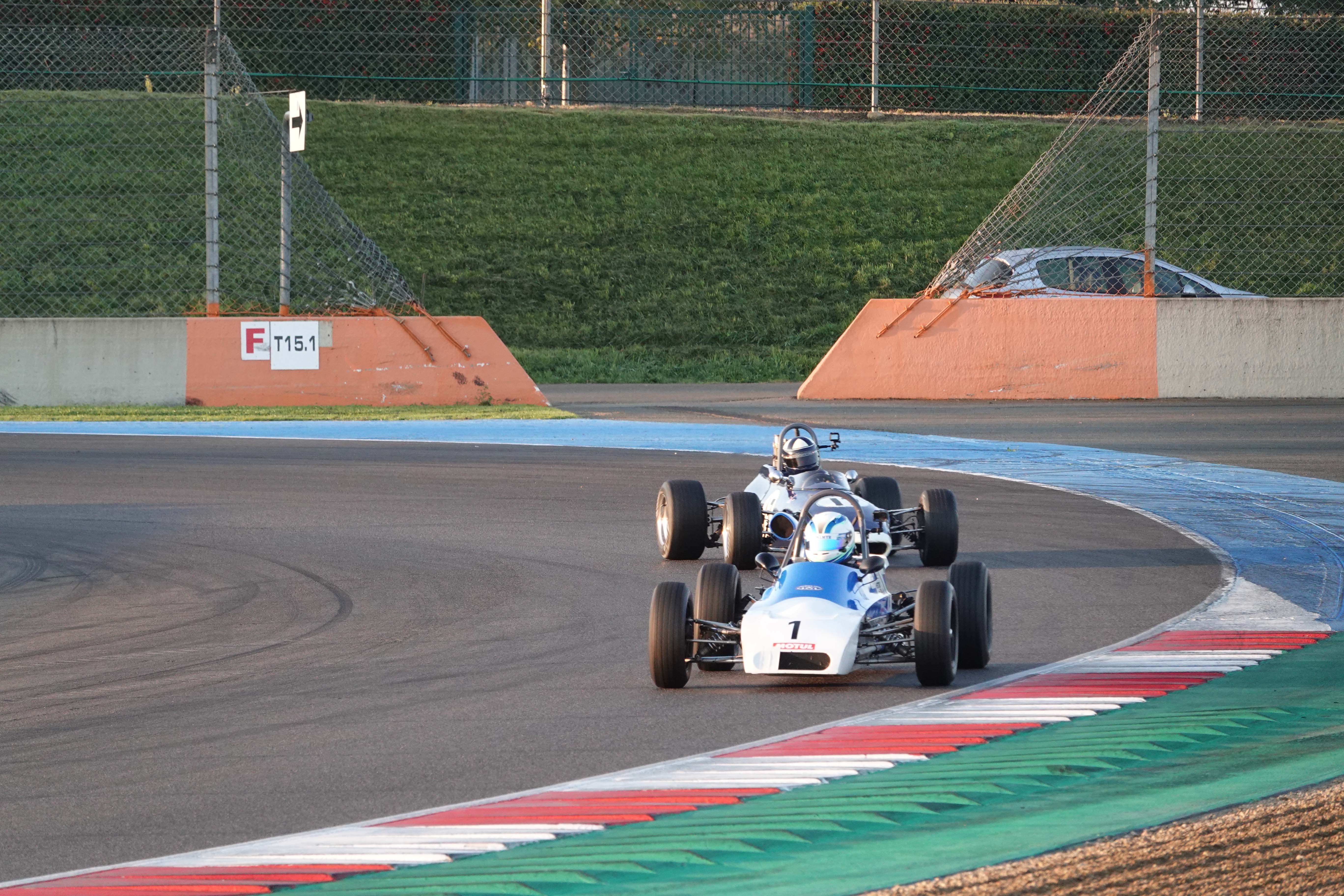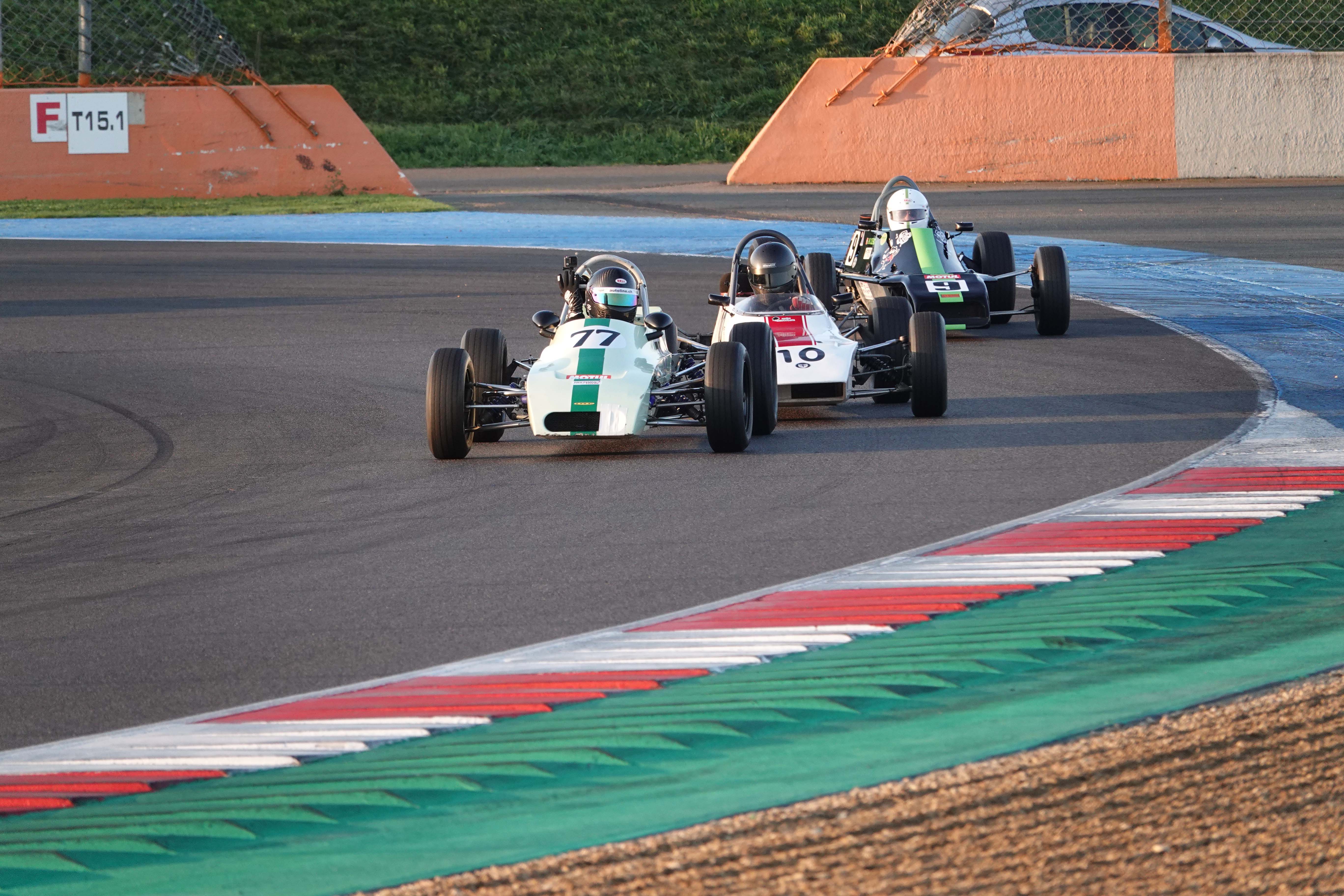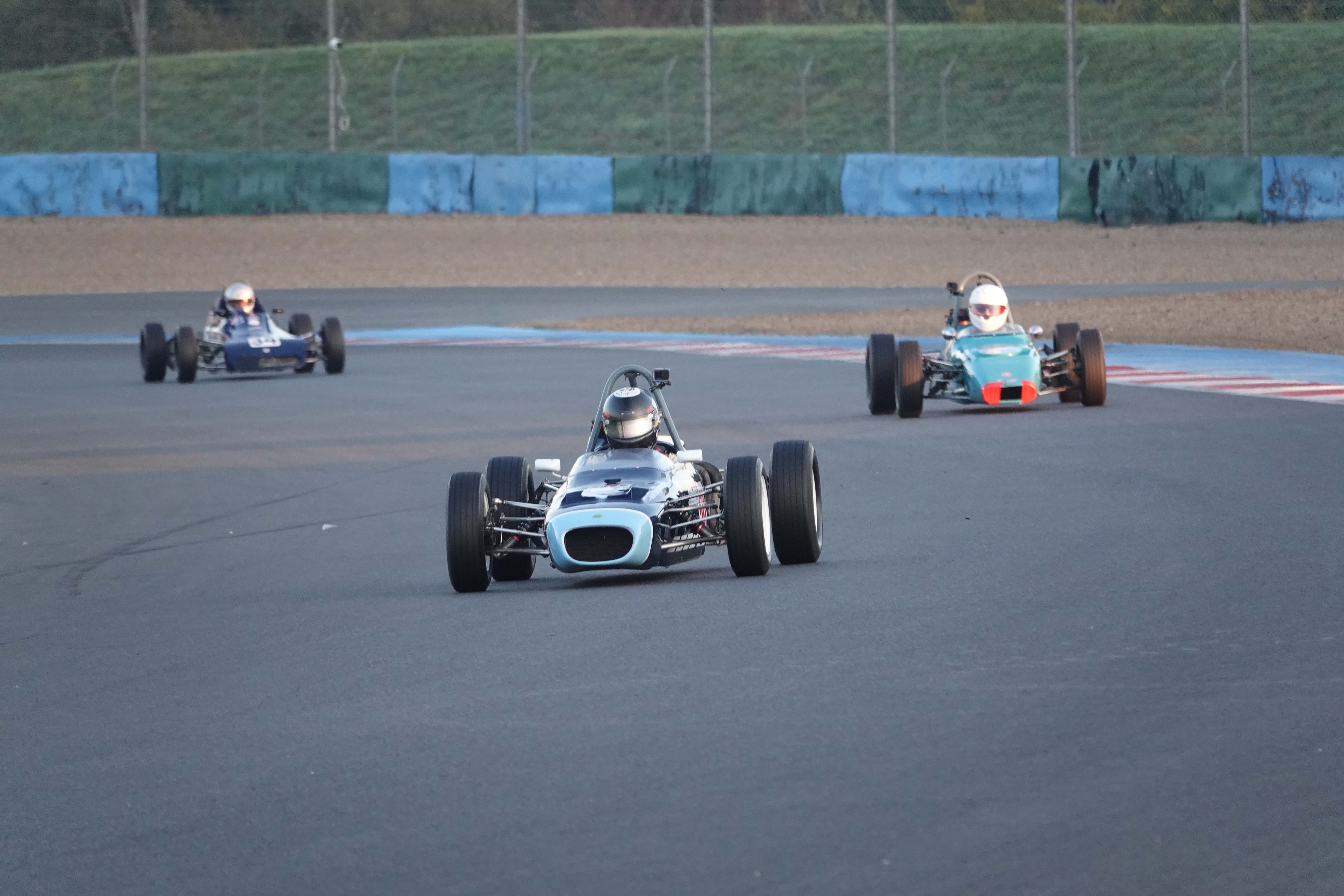Après une Grid Walk sous un beau soleil automnal, les pilotes se sont engagés dans leur première confrontation du week-end en début d’après-midi. Un départ sans encombre où les positions des quatre leaders sont maintenues, tandis que François Derossi gagne deux places sur Jonathan Devaux (Crosslé 16 F) et Augustin Sanjuan dans le peloton. Dans le troisième tour de course, le Suisse Christian Vaglio-Giors dépasse François Belle et prend la tête. François Belle, en pleine bataille pour le Championnat de France, repasse le Suisse dans le tour suivant. Troisième tour qui voit également l’abandon du Neuilléen Nicolas Leblond (Dulon LD 4).