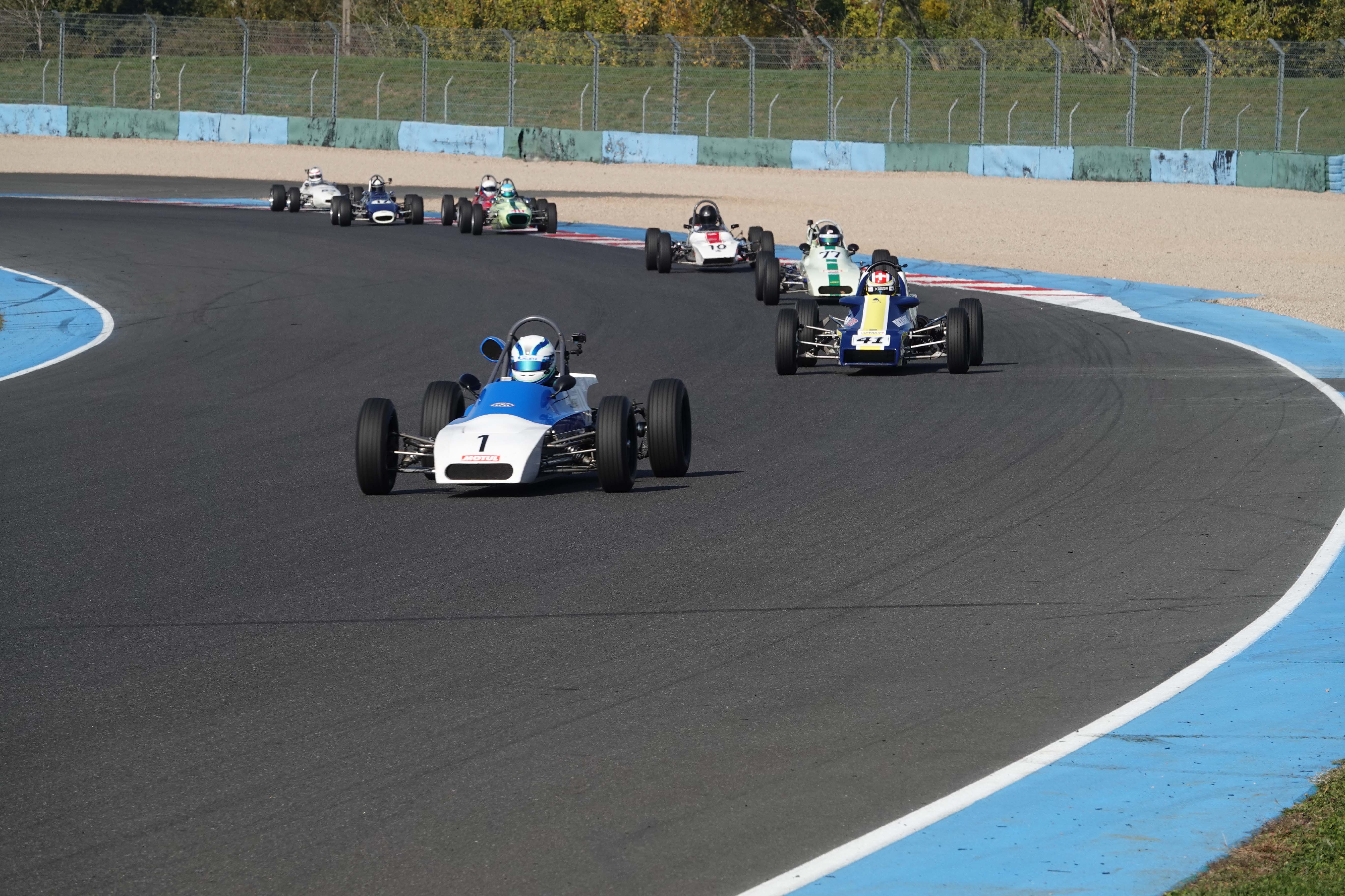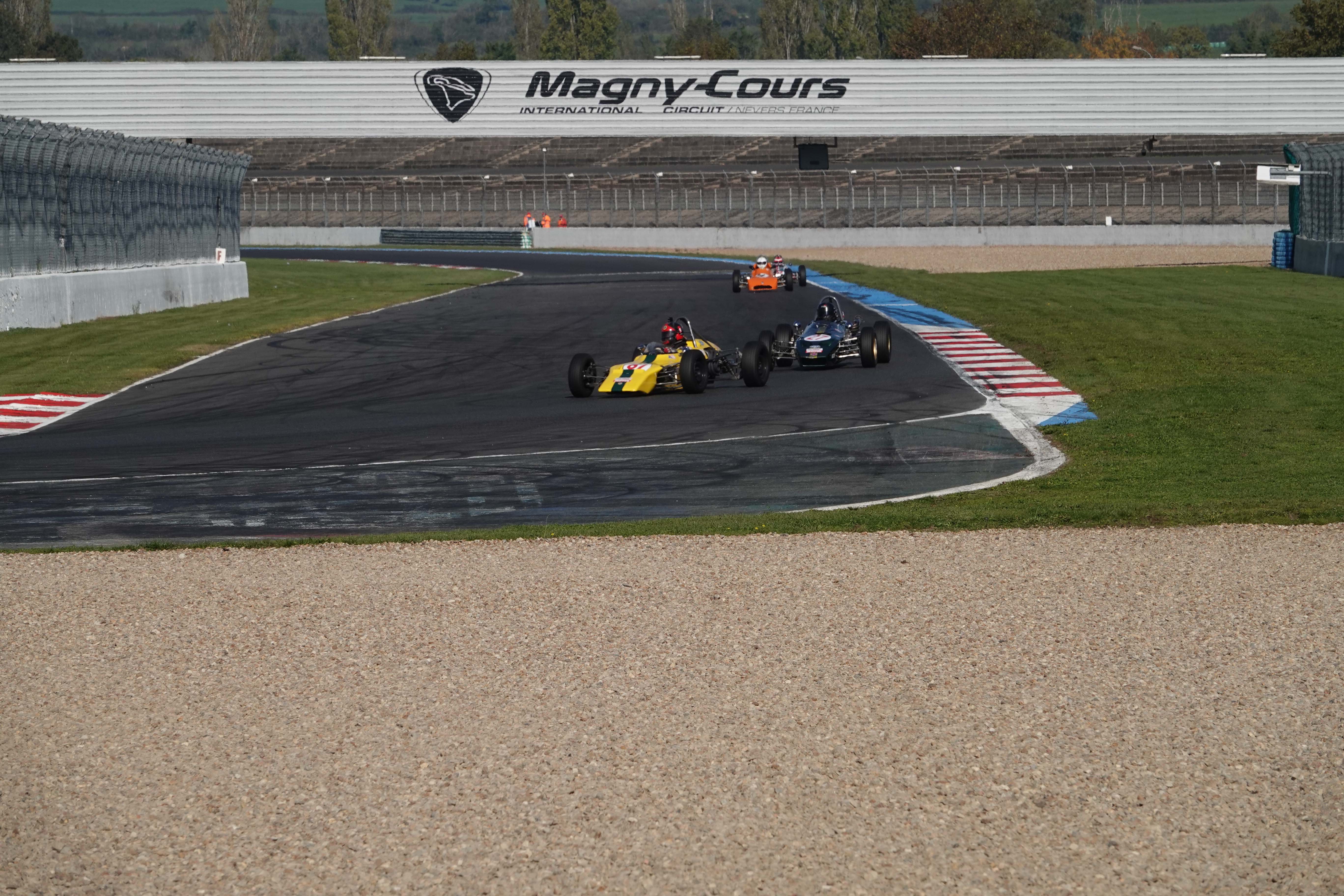 Après une Grid Walk sous un beau soleil automnal, les pilotes se sont engagés dans leur première confrontation du week-end en début d’après-midi. Un départ sans encombre où les positions des quatre leaders sont maintenues, tandis que François Derossi gagne deux places sur Jonathan Devaux (Crosslé 16 F) et Augustin Sanjuan dans le peloton. Dans le troisième tour de course, le Suisse Christian Vaglio-Giors dépasse François Belle et prend la tête. François Belle, en pleine bataille pour le Championnat de France, repasse le Suisse dans le tour suivant. Troisième tour qui voit également l’abandon du Neuilléen Nicolas Leblond (Dulon LD 4).
