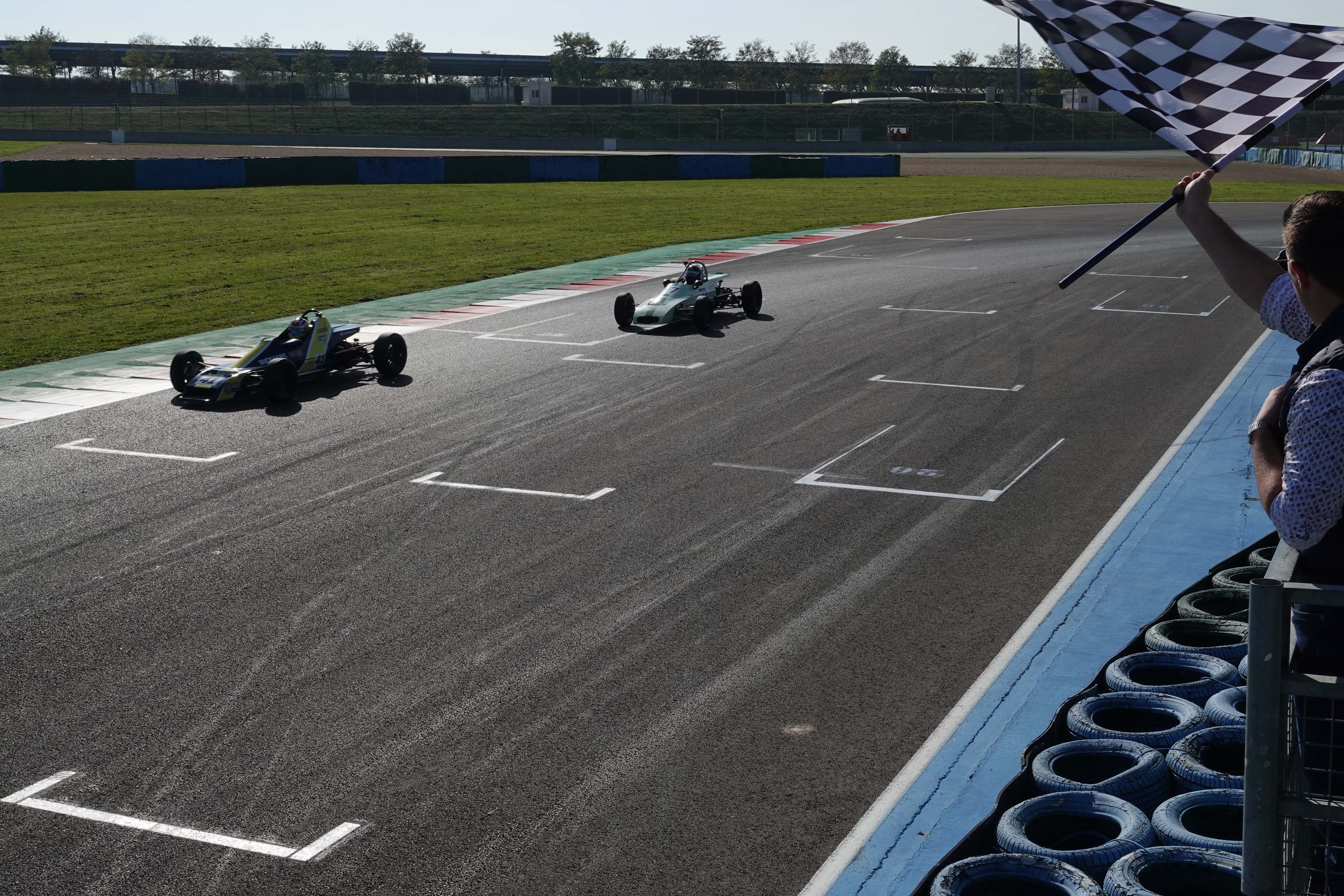 Après une Grid Walk sous un beau soleil automnal, les pilotes se sont engagés dans leur première confrontation du week-end en début d’après-midi. Un départ sans encombre où les positions des quatre leaders sont maintenues, tandis que François Derossi gagne deux places sur Jonathan Devaux (Crosslé 16 F) et Augustin Sanjuan dans le peloton. Dans le troisième tour de course, le Suisse Christian Vaglio-Giors dépasse François Belle et prend la tête. François Belle, en pleine bataille pour le Championnat de France, repasse le Suisse dans le tour suivant. Troisième tour qui voit également l’abandon du Neuilléen Nicolas Leblond (Dulon LD 4).