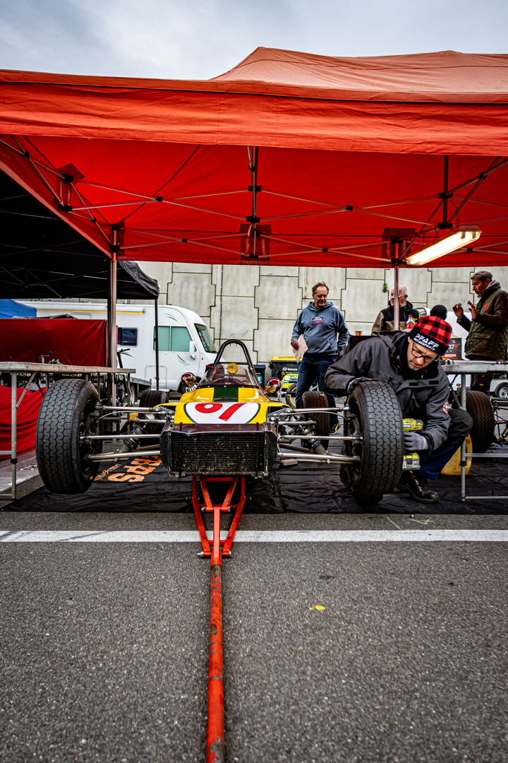 Sur une piste sèche mais froide, François Belle (Lola T 540 E) 3ème temps toutes catégories confondues est déjà leader de la classe B (pre-82) alors que Jonathan Devaux (Crosslé 16 F) 4ème temps en fait de même au niveau de la classe A (pre-74).